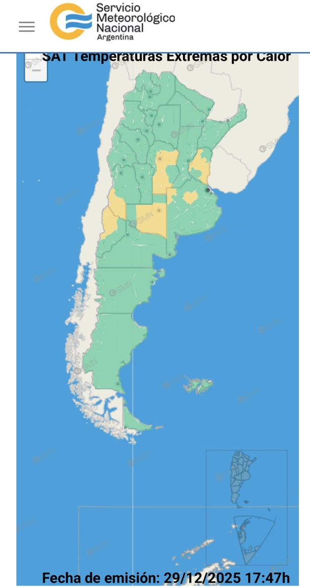 Se mantiene el alerta amarillo en zonas de Buenos Aires, Entre Ríos, La Pampa, Córdoba, Mendoza y Neuquén.