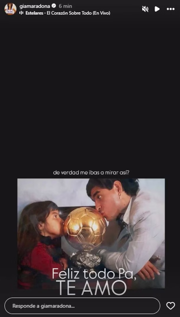 Por su parte, Gianinna eligió una foto retro junto a su padre besando el Balón de Oro, con la canción El corazón sobre todo de Estelares de fondo. Sobre la imagen, expresó: “¿De verdad me ibas a mirar así? Feliz todo, pá. Te amo”.
