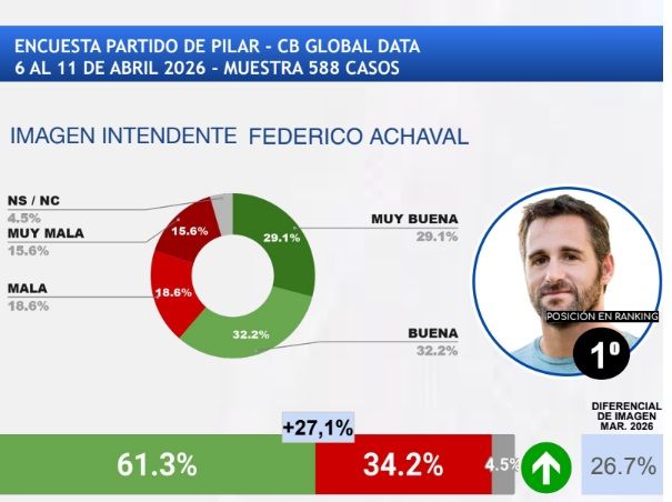 Según el informe, Achával alcanza un 61,3% de imagen positiva y registra un diferencial de +27,1 puntos respecto de la negativa, lo que lo ubica como el dirigente con mejor valoración entre los intendentes del Gran Buenos Aires.