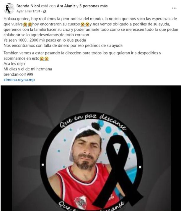 "Hoy recibimos la peor noticia del mundo, la noticia que nos sacó las esperanzas de que vuelva. Hoy (sábado) encontraron su cuerpo", expresó Brenda Nicol, su sobrina, en un emotivo mensaje en Facebook.