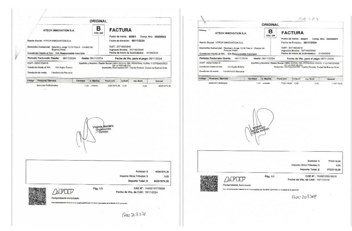 Según la documentación a la que accedieron medios nacionales, HTECH Innovation fue creada en abril de 2024, pocos meses después de la asunción de Javier Milei, y comenzó a trabajar con Osprera bajo la gestión de la primera interventora, Virginia Montero. Lo llamativo es que las primeras facturas emitidas por la firma —las N°0000001 y 0000002— fueron dirigidas directamente a la obra social, lo que indica que Osprera habría sido su primer y único cliente al momento de comenzar a operar.